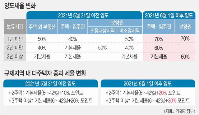 당이 걱정하는 것은 다주택자의 ‘퇴로 막힘’이다. 당정은 지난해 ‘7·10 부동산 대책’ 때 종합부동산세 최고세율은 6.0%, 양도세율은 최대 72%까지 끌어올렸다. 규제지역 내 다주택자의 양도세 중과 세율은 10% 포인트 높아졌다. 정부는 본격적인 시행은 올해 6월 1일부터 한다며 다주택자들에게 집을 팔라고 경고했다. 정부는 내부적으로 보유세·양도세 동반 인상으로 다주택자의 약 30% 주택 매각을 기대하고 있다.