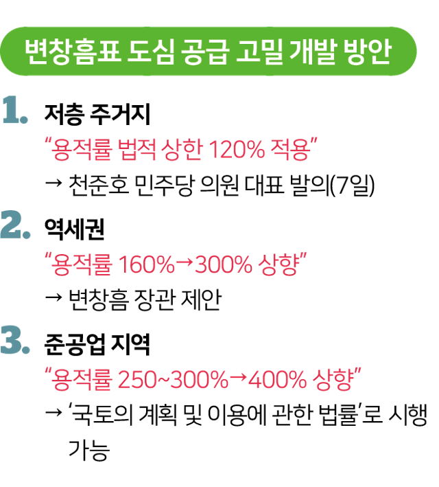 이번 개정안은 △역세권 △준공업지역 △저층 주거지 고밀 개발을 통한 도심 내 공급 대책을 구상 중인 변창흠 장관을 위한 여당의 법률 지원사격 성격이 짙다.