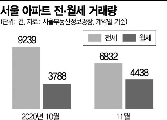 7일 서울부동산정보광장에 따르면 지난해 11월 서울 아파트 전ㆍ월세 거래량(계약일 기준)은 1만1270건으로 전월 1만3038건 대비 13.56% 감소했다. 주목되는 것은 전세와 월세 비중 변화다. 전체 거래 중 전세는 6832건으로 전월의 9239건 대비 26.05% 줄었지만 월세는 오히려 같은 기간 3788건에서 4438건으로 17.15% 증가한 것으로 분석됐다.