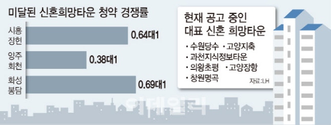 0.64대 1, 0.38대 1 , 0.69대 1. 미달을 기록한 이 경쟁률은 지난해 정부에서 공공분양한 신혼희망타운의 청약 결과다. 각각 수도권 시흥장현, 양주회천, 화성봉담에 들어선 신혼희망타운들이다.
