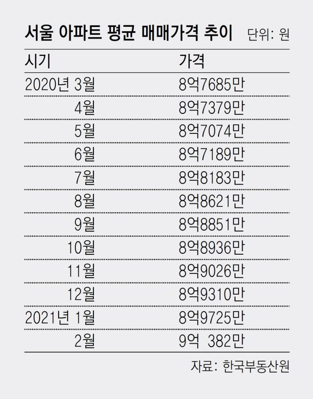 3일 한국부동산원에 따르면 올해 2월 서울 아파트 평균 매매가격은 9억382만 원으로 전월(8억9725만 원)보다 657만 원(0.73%) 올랐다. 서울 아파트 평균 매매가격은 2019년 1월 8억 원을 넘은 뒤 그해 8월까지 7억 원대로 떨어졌다가 이후 꾸준히 상승하다가 이번에 9억 원을 넘었다.