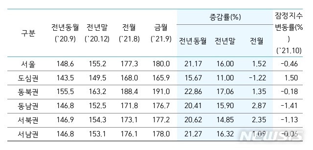 7개 대도시도 전반적으로 9월에 비해 상승폭이 줄어든 것으로 나타났다. 인천(3.42→1.33%), 대전(1.81→0.56%), 울산(1.37→0.36%), 세종(1.35→0.49%) 등의 상승폭이 크게 축소됐다.