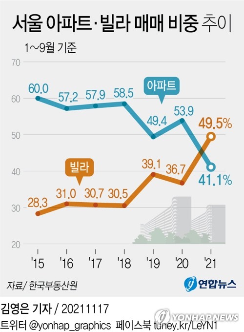 같은 기간 아파트 매매 비중은 41.1%에 그쳤다. 빌라 매매 비중이 아파트 매매 비중보다 높은 것은 2007년(빌라 44.6%·아파트 40.7%)에 이어 두 번째다.