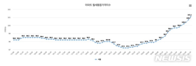 지난달 서울 아파트 월세통합가격지수는 101.1로 통계 집계가 시작된 2015년 6월 이후 역대 최고치를 찍었고, 상승률도 7월 0.19%, 8월 0.23%, 9월 0.30%, 10월 0.32% 등 오름세가 가팔라지는 중이다.