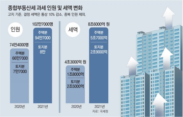 하지만 종부세가 서울 강남 등 소수만 내던 부유세 성격에서 대상자가 확대되고 있다는 지적이 나온다. 올해 주택분 종부세 과세 대상은 94만7000명으로 2017년(33만1763명)의 약 3배로 증가했다. 게다가 서울 이외 지역 거주자의 비중이 역대 최고인 절반에 이른다. 올해 1가구 1주택자 종부세 대상 인원은 지난해보다 10% 늘어 13만2000명이 됐다. 세액도 1인당 평균 97만 원에서 152만 원으로 올랐다.