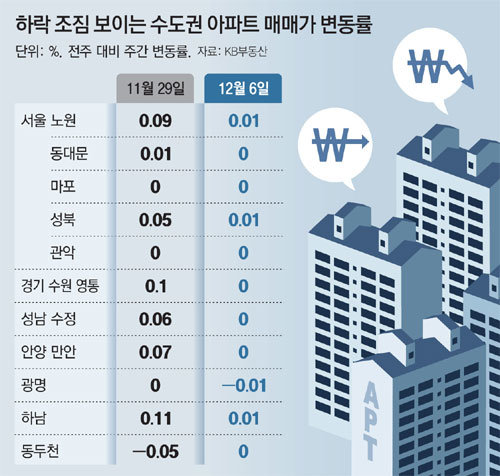 매매 수요가 얼어붙으면서 수도권에서 아파트 가격이 하락 조짐을 보이고 있다.