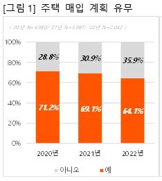 15일 부동산 정보업체 직방에 따르면 설문에 참여한 2042명 가운데 1309명(64.1%)는 내년 주택을 매입할 계획이 있다고 응답했다. 다만 주택을 매입할 계획이 있다는 응답은 조사를 시작한 2020년 이후 꾸준히 줄고 있다. 2020년엔 71.2%, 2021년엔 69.1%였다.
