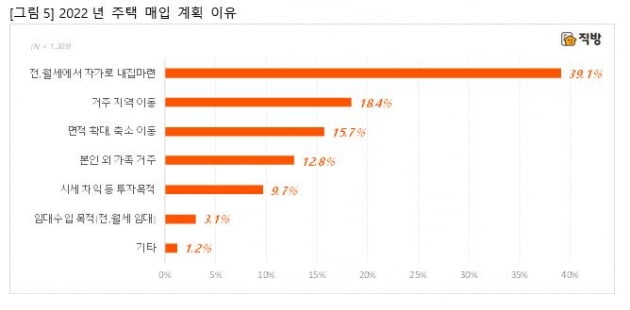 내년 주택을 매입하려는 이유로는 '전·월세에서 자가로 내 집 마련'이 39.1%로 가장 많았다. 이어 △거주지역 이동(18.4%) △면적 확대, 축소 이동(15.7%) △본인 외 가족 거주(12.8%) △시세 차익 등 투자목적(9.7%) 등의 순으로 응답했다.