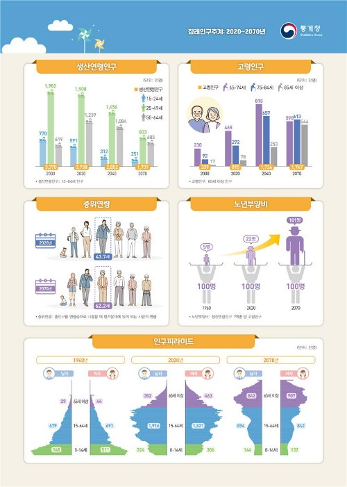한국은 OECD 국가 가운데 생산연령인구 비중은 높은 수준을, 고령인구 비중은 낮은 수준을 유지하고 있지만 2070년에는 가장 생산연령인구 비중이 낮고 고령인구 비중이 높은 나라가 될 것으로 예상된다.