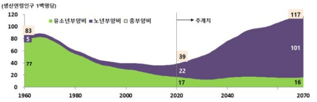 그 결과 전체 인구를 한 줄로 세웠을 때 가운데 있는 사람의 나이인 중위연령도 지난해 43.7세에서 2031년 50세를 넘고, 2070년에는 62.2세까지 증가할 전망이다.총부양비, 유소년부양비 및 노년부양비, 1960-2070년. 통계청 제공이에 따라 생산연령인구 1백명당 부양할 인구(유소년+고령인구)를 뜻하는 '총부양비'도 지난해 38.7명이었지만, 2056년 처음으로 100명을 넘어 2070년에는 117명에 달해 지난해의 약 3배로 증가할 것으로 보인다.