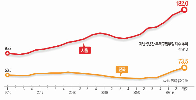 서울에 집을 가진 사람은 소득의 절반가량을 주택담보대출(주담대) 상환에 쓰고 있는 것으로 나타났다. 서울 시민의 주택구입부담지수는 올 3분기 182포인트를 기록하며 2004년 통계 작성 이래 사상 최고치를 기록했다. 내년부터 금융당국의 차주단위 총부채원리금상환비율(DSR) 규제가 시작되고 기준금리가 추가로 인상되면 서울에서 내 집 마련하기는 더욱 힘들어질 전망이다.