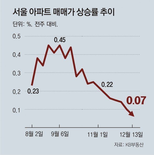실제 매수자들은 관망세로 돌아선 분위기다. 집값 상승세가 둔화하고, 매물이 쌓이는 상황에서 섣불리 매수하기보다 집값이 본격적으로 떨어지기를 기다리겠다는 것이다. 내년 3월 결혼하는 예비 신부 이모 씨(36)는 “대출 규제도 심하고 사고 싶은 아파트 가격이 너무 올라 우선 전세를 살기로 했다”며 “이제는 집값이 떨어질 때가 됐다고 본다”고 했다.