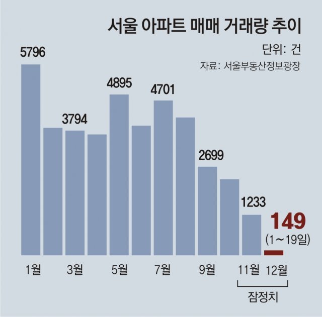 서울부동산정보광장에 따르면 11월 서울 아파트 거래량(잠정치)은 1233건으로 10월(2313건)의 절반 수준으로 줄었다. 올 6∼11월 아파트 거래량은 1만8629건으로 지난해 같은 기간 4만5699건의 41% 수준이다.