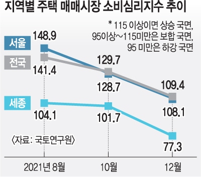 전국에서 주택 매매시장 소비심리지수가 가장 낮은 곳은 세종시로 지난 11월 94.9에서 지난달 77.3으로 17.6포인트나 하락했다.
