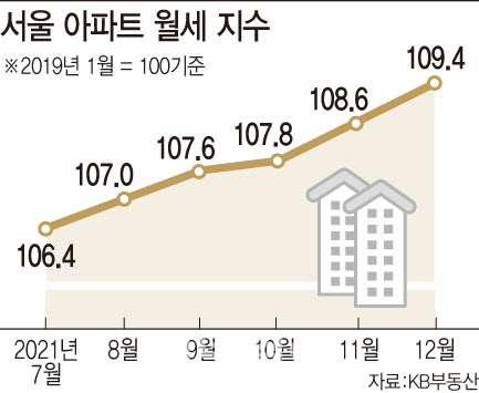 KB부동산의 월간KB주택가격동향에 따르면 12월 서울의 월세지수는 109.4로 나타났다. 관련 통계 작성이 시작된 2015년 12월 이후 역대 최고치다. 전년동월대비 5.47포인트 상승했다. KB 월세지수는 2019년 1월을 기준(100)으로 삼아 전용면적 95.8㎡ 이하 아파트의 보증금과 월세가격 변동을 수치로 나타낸 것이다.