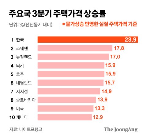 이런 '영끌족의 비명'은 비단 한국만의 현상은 아니다. 최근 들어 전 세계 집값이 사실상 꼭대기에 다다랐다는 평가가 나온다. 코로나19 팬더믹 이후 세계 각국은 경기 위축 우려 속에 저금리 기조를 유지했다. 풍부해진 유동성에, 재택근무 확산 등이 더해지면서 주거 수요는 폭발적으로 증가했다. 주택 공급이 이를 뒷받침하지 못하면서 세계 각국의 집값은 급등했다. 경제협력개발기구(OECD)는 "지난해 3분기 회원국의 주택 가격이 평균 13.1% 상승했다"고 밝혔다.