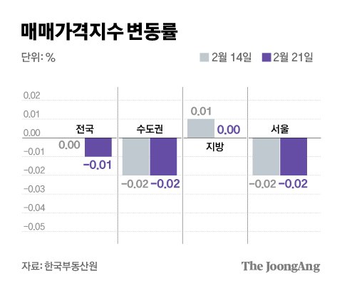 서울 아파트값도 일주일 전보다 0.02% 떨어졌다. 하락 폭은 지난주와 같다. 경기(-0.03%)와 인천(-0.02%) 아파트값은 지난주보다 0.01%포인트씩 하락 폭이 커졌다. 수도권 아파트값은 0.02% 하락했다.