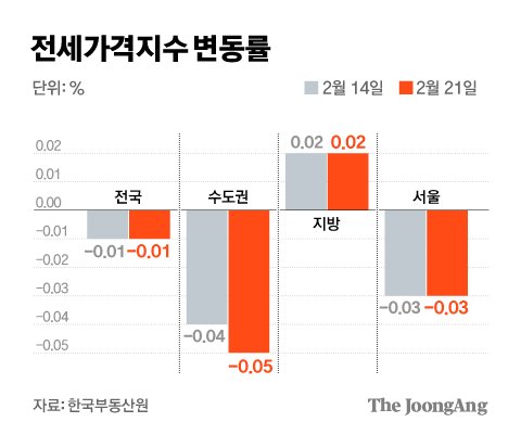 서울에서는 서초구 아파트값이 0.01% 내렸다. 2020년 6월 1일(-0.04%) 이후 1년8개월여 만에 하락 전환이다. 강남구는 지난주보다 0.01% 하락하며 2주 연속 약세를 보였다. 서울 25개 자치구 가운데 보합을 기록한 성동구를 제외한 24개 자치구의 아파트값이 내렸다. 경기에서는 시흥(-0.15%), 화성(-0.11%) 등지는 지난주보다 낙폭이 확대됐다. 반면 수도권광역급행철도(GTX) 연결 공약 등 개발 호재가 있는 평택과 의정부시는 나란히 0.01% 올랐다. 부동산원은 “전세대출금리 부담 및 방학 이사수요 마무리 등으로 하락세가 지속하고 있다”며 “신규 입주물량 영향 있는 지역이나 고가 단지 위주로 하락하는 현상이 나타난다”고 밝혔다.