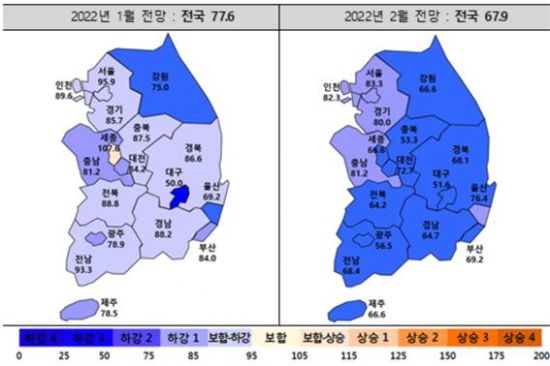 10일 주택산업연구원이 발표한 ‘2월 전국 주택사업경기실사지수(HBSI)’ 자료에 따르면 이달 HBSI 전망치는 전월(77.6)과 비교해 9.7포인트 하락한 67.9를 기록했다. 한국주택협회와 대한주택건설협회 회원사 500곳 이상을 대상으로 조사하는 HBSI는 공급자(주택·건설업체) 입장에서 주택사업 경기를 종합적으로 판단하는 지표다.