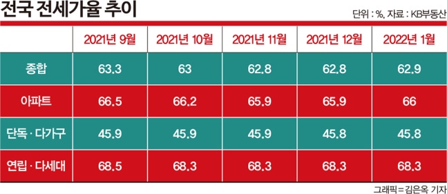 KB국민은행의 주택가격 동향에 따르면 지난 1월 전국 아파트 전세가격 상승률(0.33%)이 매매가 상승률(0.32%)을 앞섰다. 전세가율이 오름세로 돌아선 것이다. 서울시내 아파트 전세가율은 지난해 11월 54.48%에서 12월 54.54%로 소폭 오른 뒤 올 1월엔 54.59%로 2개월 연속 증가했다. 지난해 12월 65.9%였던 전국 아파트 전세가율도 올 1월엔 66.0%를 기록했다. 단독과 연립주택 등을 포함한 전국 전세가율은 같은 기간 62.8%에서 62.9%로 상승했다.