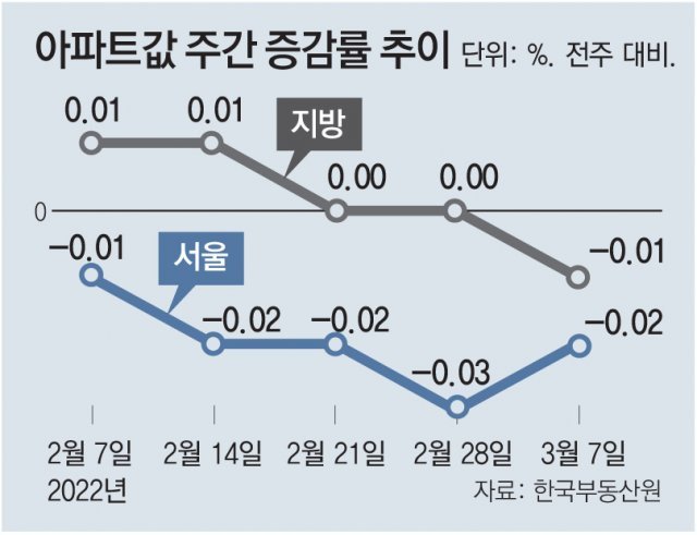 10일 한국부동산원이 발표한 주간 아파트 가격 동향에 따르면 3월 첫째 주(7일 기준) 서울 아파트 값은 지난주(―0.03%) 대비 0.02% 떨어져 하락폭이 줄었다. 강남구는 0.01% 하락해 전주(―0.02%)보다 낙폭이 감소했고 송파구는 2주 연속 0.01% 하락했다.