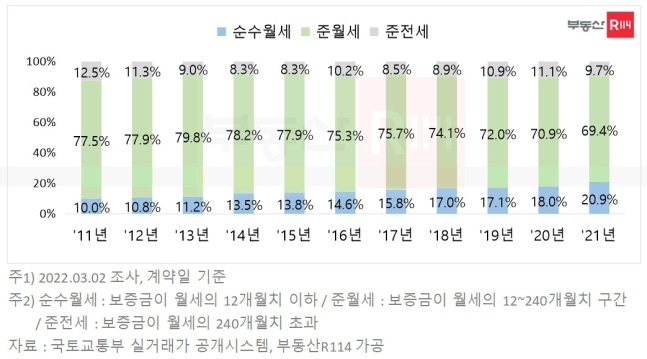 2021년 2만5607건 중 5355건(20.9%) 순수 월세