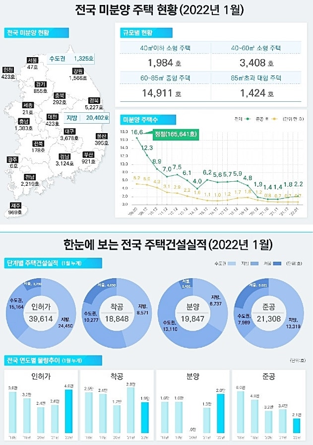 22일 국토교통부에 따르면 지난 1월 기준 전국의 미분양 주택은 총 2만1727가구로, 전월(지난해 12월 기준·1만7710가구) 대비 22.7%(4017가구) 증가했다. 다만 악성 미분양으로 불리는 '준공 후 미분양'은 7165가구로 전월(7449가구) 대비 3.8% 감소했다.