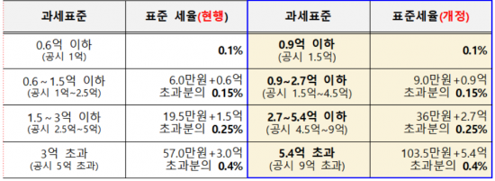 ◆재산세·종부세 세부담 상한비율 낮춰야=우선 재산세의 경우 주택가격 상승과 공시가격 현실화 등 변화된 시장상황을 반영해 현행 주택분 재산세 세율체계를 손질하는데 초점을 뒀다. 구체적으로 현행 주택분 재산세 4단계 세율체계는 유지하되 최고세율 적용 구간을 현행 공시가격 5억원에서 9억원으로 상향 조정하는 것을 건의했다.