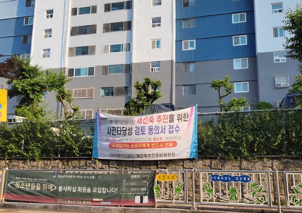30일 부산 수영구 망미동의 한 아파트 벽면에 ‘재건축 추진을 위한 사전타당성 동의서 접수 중’이란 플래카드가 걸려 있다. 해당 아파트에서 도보로 10분 거리에 있는 대형 아파트 단지 인근에도 재건축 추진위원회의 활동을 알리는 플래카드가 붙어 있다. 구는 다르지만 걸어서 30분이면 갈 수 있는 연제구 연산동의 주택가에도 재개발 사업을 예고하는 플래카드가 눈에 띄어 해당 지역에서 도시정비사업이 활발히 진행되고 있음을 짐작할 수 있다.