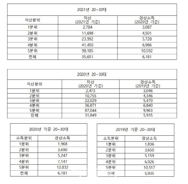 이에 따라 자산 하위 20% 대비 상위 20%의 자산격차를 보여주는 지표인 자산 5분위 배율은 2020년 35.20배에서 지난해 35.27배로 더 악화됐다. 2019년 대비(33.21배)로는 2.06배포인트나 더 악화됐다. 2019년 20~30세대 내 상위 20%의 자산은 8억원, 하위 20%의 자산은 2409만원이었다.