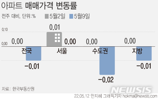13일 한국부동산원에 따르면 5월 둘째 주(9일 기준) 수도권 아파트값은 전주 대비 0.02% 떨어졌다. 지난주(2일 기준) 보합 전환됐으나 1주 만에 다시 하락했다.