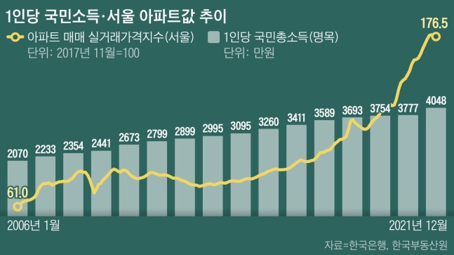 국민 1인당 버는 돈이 두 배에 이르는 동안 우리나라의 투자수요가 집중되는 서울의 아파트값은 그동안 얼마나 올랐을까. 한국부동산원에 따르면 지난해 말 기준 서울 아파트 매매 실거래가격지수는 176.5로 2006년 1월(61.0)과 비교하면 세 배 가까이로 올랐다.