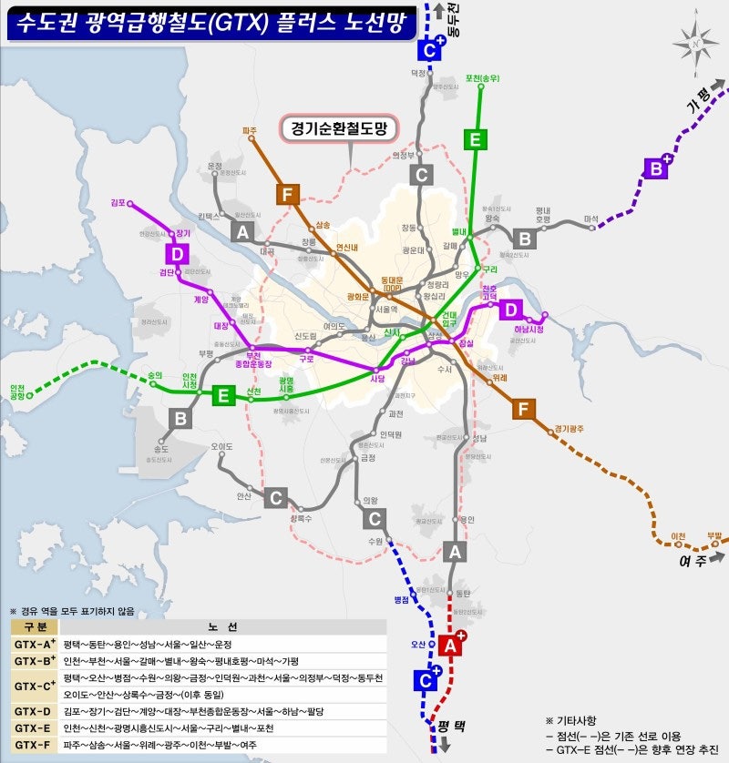 GTX-A+는 동탄에서 평택까지, GTX-B+는 마석에서 가평,GTX-C+의 북부 구간은 동두천까지, 남부 구간은 병점․오산․평택까지 연장할 계획이다. 또한, 금정에서 안산, 시흥으로 분기되는 노선도 차질 없이 추진할 예정이다.