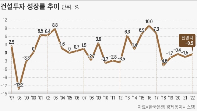 건설투자가 한은 전망대로 간다면 이는 5년 연속 역성장이다. 건설투자는 2015년 6.3%, 2016년 10%, 2017년 7.3%로 큰 폭의 플러스 성장을 하며 국내총생산(GDP) 성장을 이끌어왔다. 그러다 문재인 정부가 들어선 이후인 2018년 -4.6%를 기록한 이후 2019년 -1.7%, 2020년 -0.4%, 2021년 -1.5% 등 연거푸 마이너스를 기록했다.