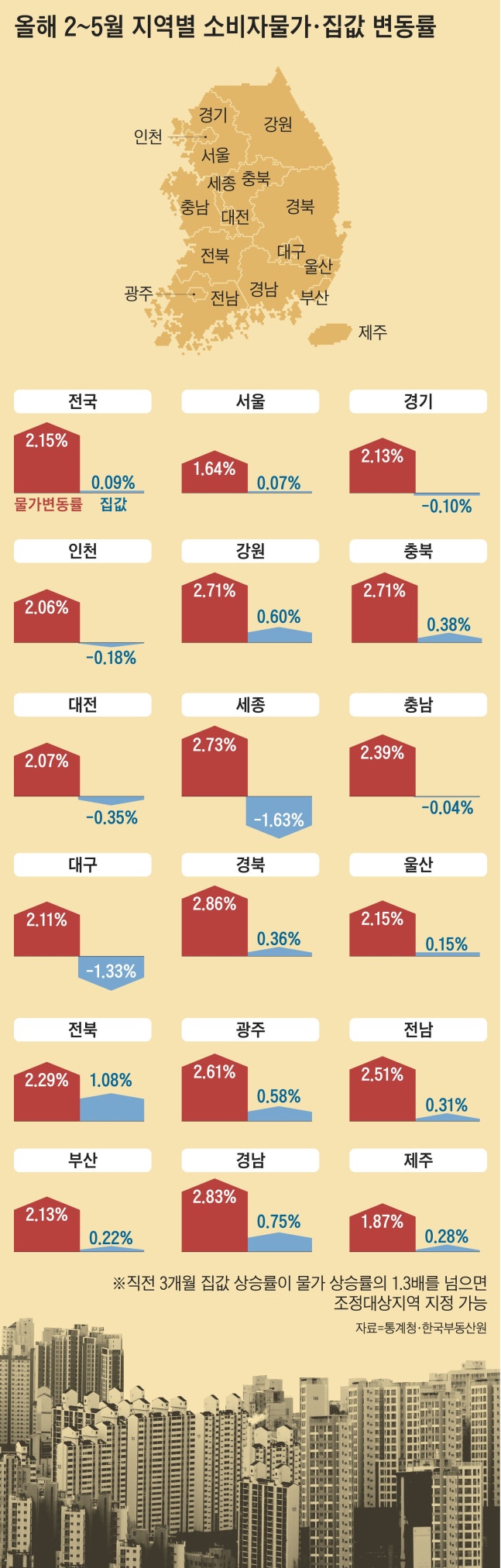 25구(區) 모두 조정대상지역인 서울은 올해 2월부터 5월까지 소비자물가는 1.64% 올랐지만, 집값은 0.07% 오르는 데 그쳤다. 같은 기간 집값이 가장 많이 오른 서초구(0.4%)와 용산구(0.39%)도 물가 상승률의 4분의 1에도 못 미쳤다. 경기(-0.1%), 인천(-0.18%), 대구(-1.33%), 대구(-1.33%) 등은 물가는 2% 넘게 올랐는데 집값은 오히려 내렸다.