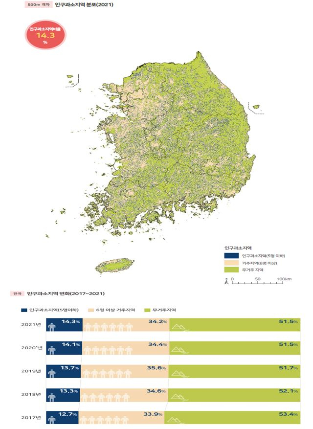 우리나라 전 국토의 14.3%는 거주자가 5인 이하인 인구 과소지역인 것으로 조사됐다. 전국 시·도 중에서 서울시의 인구과소비율이 가장 낮은 반면 강원도가 가장 높은 것으로 나타났다.