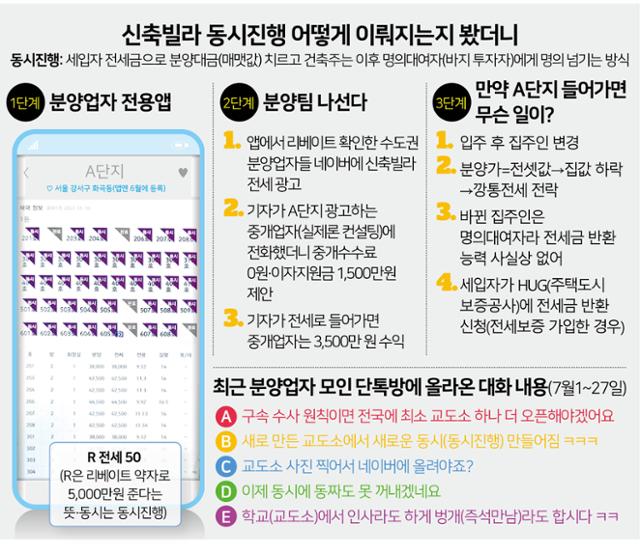상황이 이렇다 보니 전셋값으로 분양대금(매맷값)을 치르는 소위 '동시진행' 업자들이 이 제도를 악용하고 있다. 이들은 집주인이 원하는 시세(예시: 2억 원)보다 더 비싸게(2억5,000만 원) 팔아주는 대신 남는 차액(5,000만 원)을 수수료로 챙기는데, 비싸게 파는 비결이 바로 매매 호가보다 높은 가격으로 전세를 놓는 것이다.