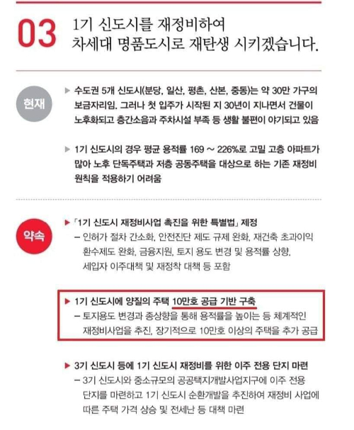 윤석열 대통령 공약집. 원희룡 국토교통부 장관이 오는 2024년까지 1기신도시 마스터플랜을 수립하겠다고 밝힌 것에 대해 "(윤석열 정부의) 공약 파기가 아니다"라고 강조했다. 애초에 '10만호 공급'이 아니라 '10만호 공급기반 구축'이라고 공약했다는 것이다.