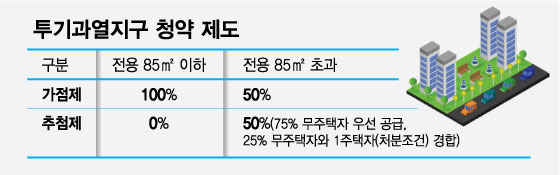 현행 청약 제도는 투기과열지구에서 전용 85㎡ 초과 물량의 50%, 조정대상지역의 경우 70%에 대해 가점순이 아니라 추첨으로 당첨자를 선정한다. 이 추첨제 물량 중 25%에 한해서는 1주택자도 당첨이 가능한데, 당첨 시 기존주택을 처분하겠다고 약속해야 한다.