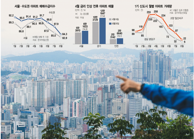 한국은행이 사상 최초로 기준금리를 4회 연속 올린 가운데 서울·수도권 아파트 매매수급지수가 3년 1개월 만에 가장 낮은 수준을 기록하며 매수심리가 극도로 위축되고 있다. 기준금리 연속 인상이 시작된 4월부터 매수세가 쪼그라들며 서울과 경기·인천 모두 아파트 매물이 15% 안팎으로 증가했다. 대선 이후 재건축 기대감에 매수가 몰리던 1기 신도시도 ‘거래 절벽’이 심화되며 성남 분당구는 사상 최저 거래량을 경신할 것으로 전망된다.