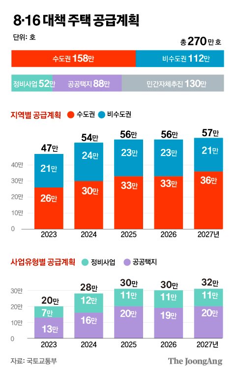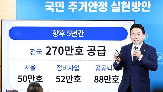 정부가 앞으로 5년간 서울 50만 가구를 포함해 전국에 270만 가구의 주택을 공급하겠다고 발표했다. 민간이 주도하는 재건축 사업과 역세권 재개발 등을 통해 도심의 공급량을 대폭 늘린다. 수요와 공급이 일치하는 '좋은 공급'을 하겠다는 것이 목표다. 이를 위해 공공개발에만 주로 부여했던 용적률과 세제 혜택 등 각종 인센티브를 민간개발 사업에도 확대 적용한다.정부는 추경호 경제부총리 겸 기획재정부 장관 주재로 부동산 관계 장관회의를 열고 이런 내용이 담긴 '국민 주거안정 실현 방안'을 발표했다. 브리핑에 나선 원희룡 국토교통부 장관은 “지난 정부에서도 여러 주택공급 정책이 있었지만 겹겹이 쌓인 과도한 규제 때문에 도심 등 선호 입지의 공급은 위축됐다”며 “국민의 주거 상향 수요를 채우기 위해 주택공급의 대부분을 담당하는 민간의 활력을 키우고 공공은 시장기능을 보완하는 역할에 집중할 것”이라고 강조했다.