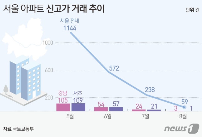 7월 신고가 거래 238건과 비교하면 75%(179건) 감소했으며, 지난 5월 1085건보다는 무려 95%(1085건) 줄어든 수준이다.