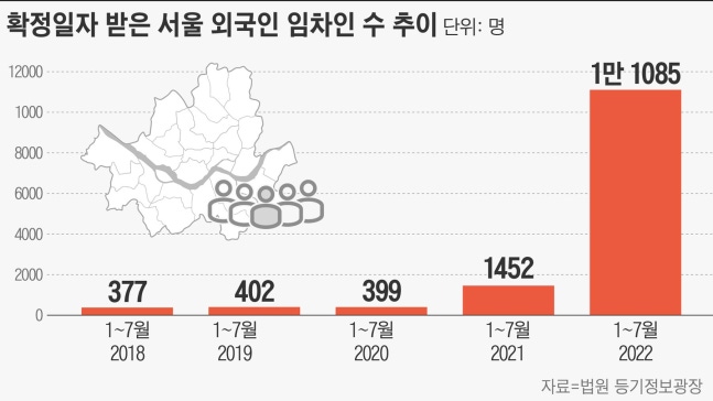 17일 법원 등기정보광장에 따르면 서울시에서 확정 일자를 부여받은 외국인 임차인의 수는 올들어 7월까지 1만1085명인 것으로 집계됐다. 1년 전 같은 기간의 1452명에 비해 7.6배 증가한 규모다. 4년 전인 2018년 같은 기간의 외국인 임차인 수는 377명으로 그 사이 30배 가까이 늘었다.