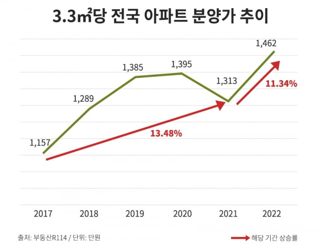 2일 부동산R114에 따르면 올해 7월 아파트 분양가는 3.3㎡당 1462만원을 기록했다. 전년 평균(1313만원) 대비 약 11% 높다. 2017년부터 2021년까지 직전 5년 동안 13%가량 상승한 것과 비교해 불과 반년 만에 10%대로 더욱 가파르게 뛰었다.