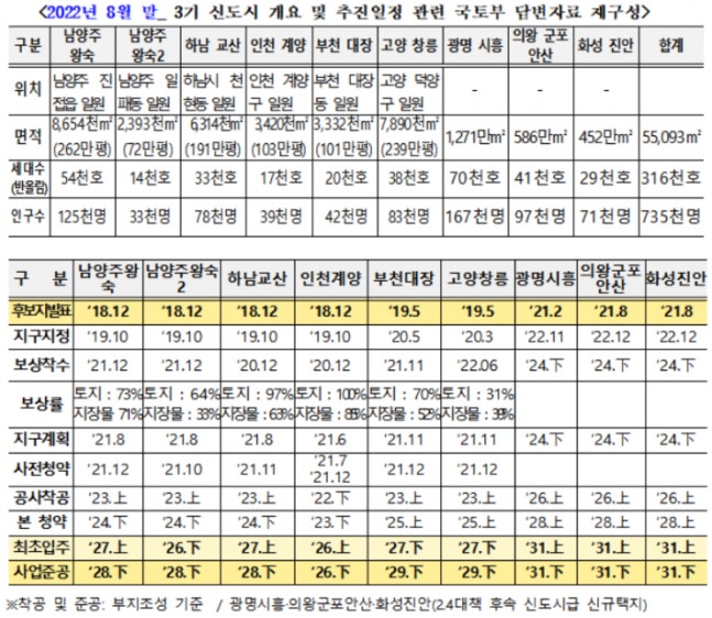 그러나 현재 (22년 8월 기준) 최초입주 예정일은 △인천 계양 26년 상반기 △남양주왕숙2 26년 하반기 △하남교산·남양주왕숙 27년 상반기 △부천대장·고양창릉 27년 하반기로 약 1~2년 가량 뒤로 밀린 것으로 확인됐다.