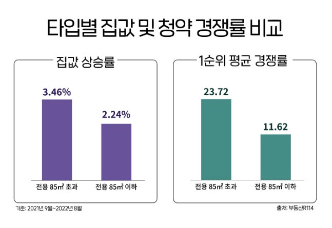 해당 기간 분양 시장에서도 대형 타입에 청약자들이 몰렸다. 최근 1년간 2만 1922가구의 대형 타입 신규 물량에 51만 9981건의 1순위 청약이 접수돼 평균 23.72대 1의 경쟁률을 기록했다. 중소형 타입은 12만 5819가구에 146만 2296건의 1순위 청약이 접수돼 경쟁률은 평균 11.62대 1로 대형 경쟁률의 절반 수준이었다.