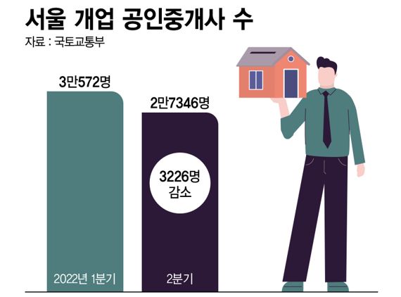 한국공인중개사협회에 따르면 8월 전국 신규개업 공인중개업소는 1074개로 지난 2019년 9월(994개) 이후 최저치를 기록했다. 7월에는 2년 10개월만의 최저 개업과 함께 전국 17개 광역·특별지방자치단체 중 8곳에서 공인중개업소 신규개업 보다 폐·휴업이 많았다. 공인중개사 수 역시 4월(11만8280명), 5월(11만8860명), 6월(11만8924명) 3개월간 상승세를 이어오다 지난달 11만8917명으로 줄었다. 2·4분기 서울 개업 공인중개사 수는 1·4분기 보다 3226명 감소한 2만7346명으로 집계됐다.