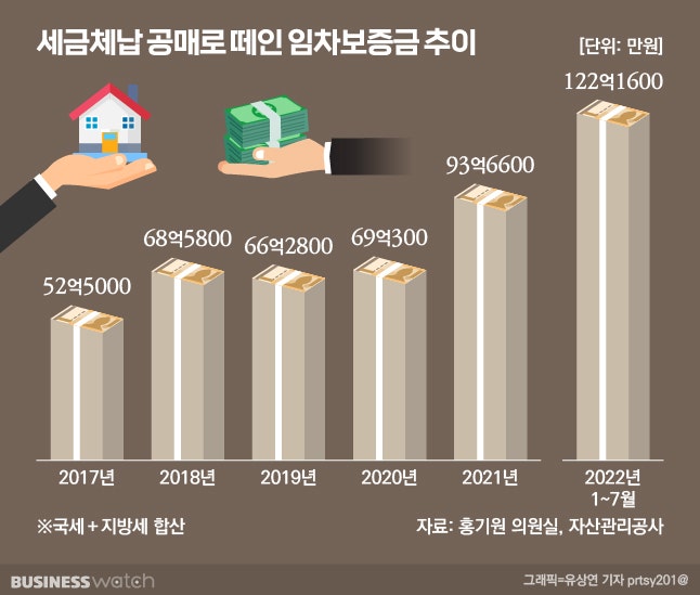 한국자산관리공사 자료를 보면 세금체납에 따른 부동산 공매로 세입자가 회수하지 못한 임차보증금은 2017년 이후 2021년까지 5년간 350억원이 넘는다.