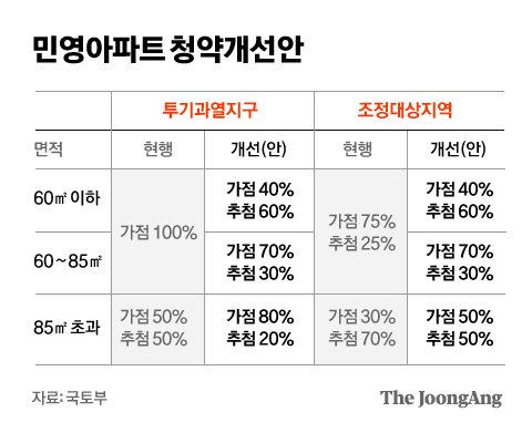 민간분양의 경우 추첨제를 대폭 늘린다. 서울 등 투기과열지구의 경우 전용면적 85㎡ 이하 중소형 평수를 분양할 때 100% 가점제로 공급했지만, 내년 초부터 60㎡ 이하는 일반분양 물량의 60%, 60㎡ 초과~85㎡ 이하는 30%를 추첨제로 공급한다. 상대적으로 가점이 낮은 청년층의 당첨 확률을 높이겠다는 취지다. 조정대상 지역도 동일한 비율을 적용한다. 대신 85㎡ 초과 평형은 가점제 비중을 늘린다. 투기과열지구의 경우 기존에 가점 50%, 추첨 50%에서 가점 80%, 추첨 20%로, 조정대상지역도 가점 30%, 추첨 70%에서 가점 50%, 추첨 50%로 조정한다.