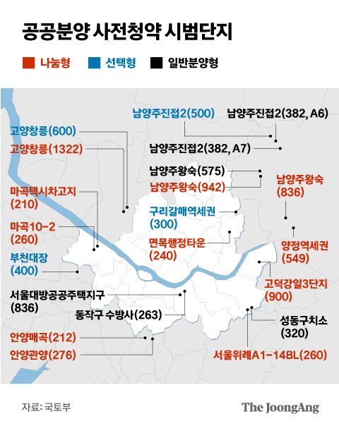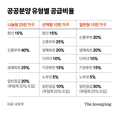 공공분양 유형도 ‘나눔형(25만 가구)’ ‘선택형(10만 가구)’ ‘일반형(15만 가구)’으로 세분화한다. 나눔형은 시세의 70%로 분양받고 나중에 팔 때는 공공에 환매해 시세차익의 최대 70%를 가질 수 있다. 선택형은 임대로 살다가 6년 뒤에 분양 여부를 결정하면 된다. 임대료는 입주 시 추정 분양가의 절반을 보증금으로 내고, 나머지에 대한 월세를 시세의 70~80% 수준으로 낸다. 최종 분양가는 입주할 때의 추정 분양가와 실제 분양받을 때 감정가격의 평균가격으로 분양가를 책정한다. 일반형은 기존대로 시세의 80% 수준으로 분양한다.